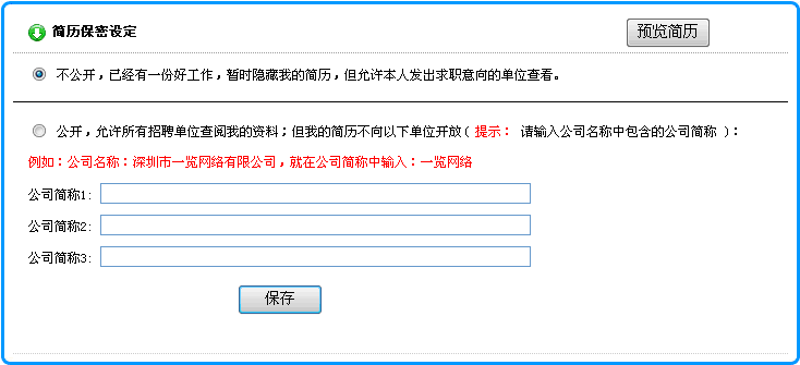 2)在打開的頁面中,選擇 不公開 ( 暫時(shí)隱藏我的簡歷,但允許發(fā)出求職意向的單位查看! )后, 點(diǎn)擊"保存"按鈕即可. 如下圖所示: