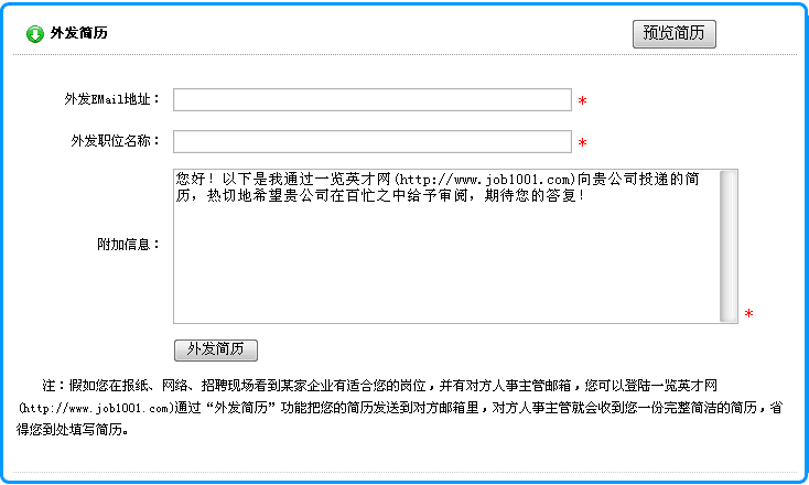 2) 在打開的頁面中,輸入接收企業(yè)的Email地址、應(yīng)聘的職位名稱以及您的其它要求后,點(diǎn)擊"發(fā)送簡歷"按鈕就可以了。如下圖所示: